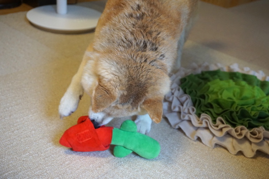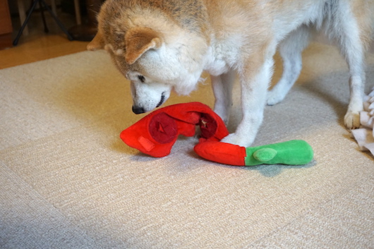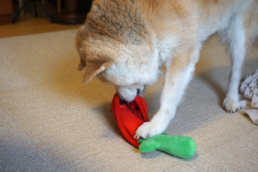 マコ母が知育おもちゃにおやつを詰めてくれています。