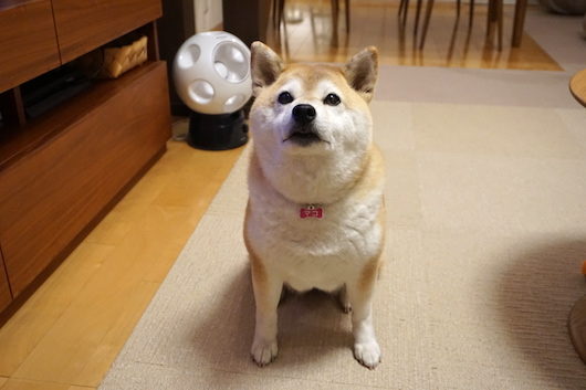 ピンと背筋を伸ばし、おやつを見つめています。。