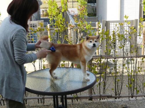 お出かけ前に、お庭でブラッシング。