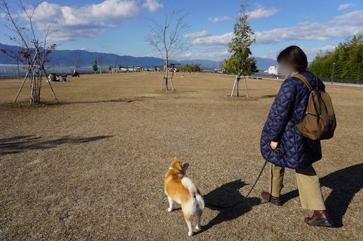 店内にはマコは入れないので、まずは原っぱの方へ。